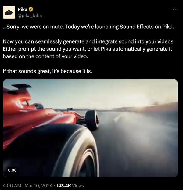 视频生成 AI 工具 Pika 宣布,他们推出了 Pika 上的「音效」(Sound Effects)功能。Pika 官方介绍,用户现在可以无缝生成声音并集成到视频当中。用户可以使用提示词生成自己想要的声音,或者让 Pika 根据视频内容自动生成。音效功能目前为测试版,仅面向 Super Collaborators 和专业用户推出,Pika 表示很快会向所有用户推出该功能。