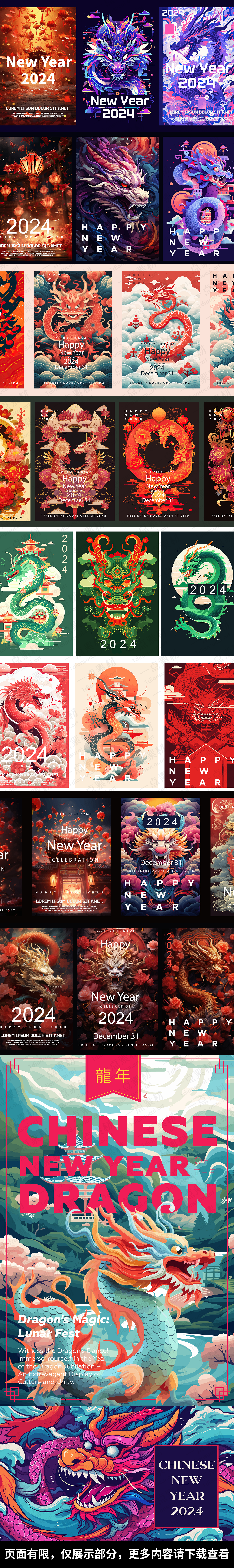 YD0028-2024年新春新年龙年创意潮流吉祥喜庆龙元素插画海报模板AI素材