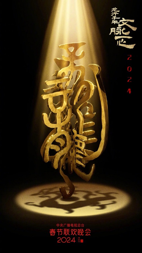 2024 央视春晚海报发布,以汉字「龙」的演变历程为核心创意,甲骨文、金文、篆、楷、行、草等书体的「龙」字形,透过动态的形式呈现在历史长河的代代演变。